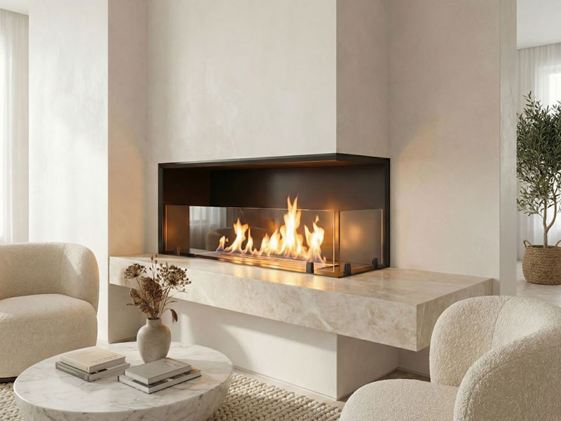BKBF-A è il biocamino da incasso bifacciale ad angolo (destro e sinistro) per interni ed esterni.