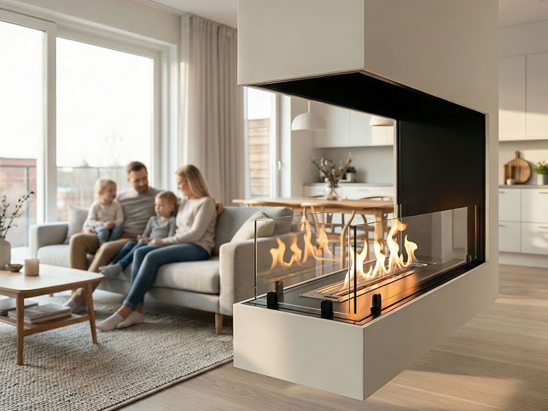 BKBF-T è il biocamino da incasso trifacciale laterale per una penisola di separazione ambienti.