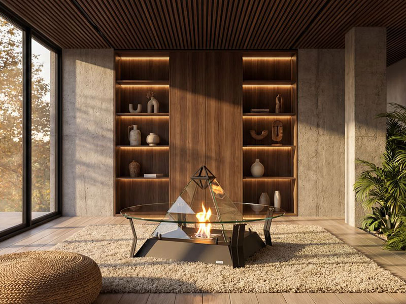 Crystal è il nuovo tavolino di vetro studiato per avvolgere il bioKamino Louvre e poter essere così posizionato in ambienti di dimensioni ridotte senza dover rinunciare al fascino di un design unico.