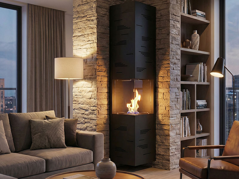 La llama está protegida en toda su altura por 2 paneles de vidrio en el modelo de esquina.